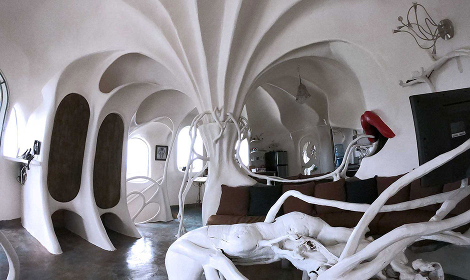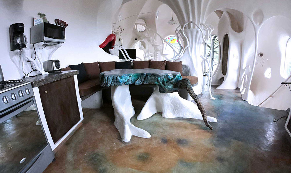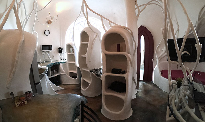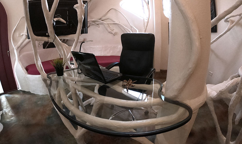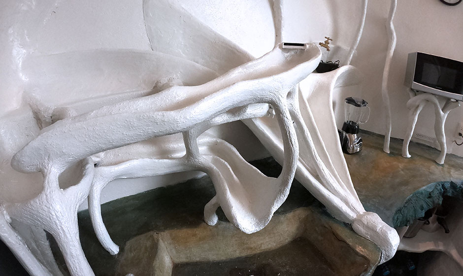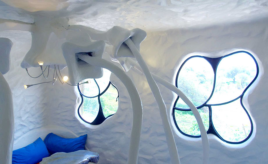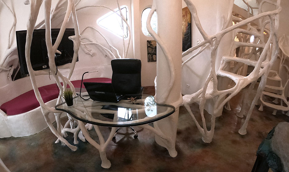 How do you make these crazy houses? And, do you take a lot of drugs? The answer to the 2nd is, no, only the occasional aspirin. When it comes to designing the rooms in the house, everything starts out with some curves in the computer, and a few dreams. Designs are drafted out in 3D on the computer, and re-worked. My team of artist cement workers see the designs from many different perspectives. The curves are then roughed out using plastic tubing, to actual size. The forms are first built in metal bar and wire mesh. The wire mesh is filled with cement. A smooth finished top coat of cement completes the surface. The magical design is transformed from the computer to something real. Wow, it’s like having a big 3D printer.